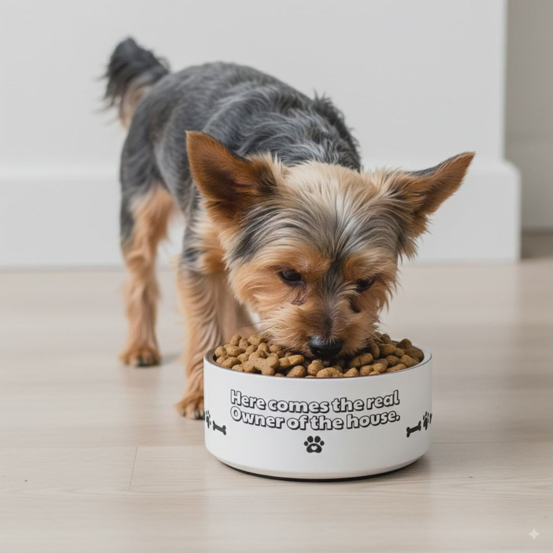 Make mealtime more fun with this pet bowl featuring the playful phrase “The True Owner of the House Eats Here.”